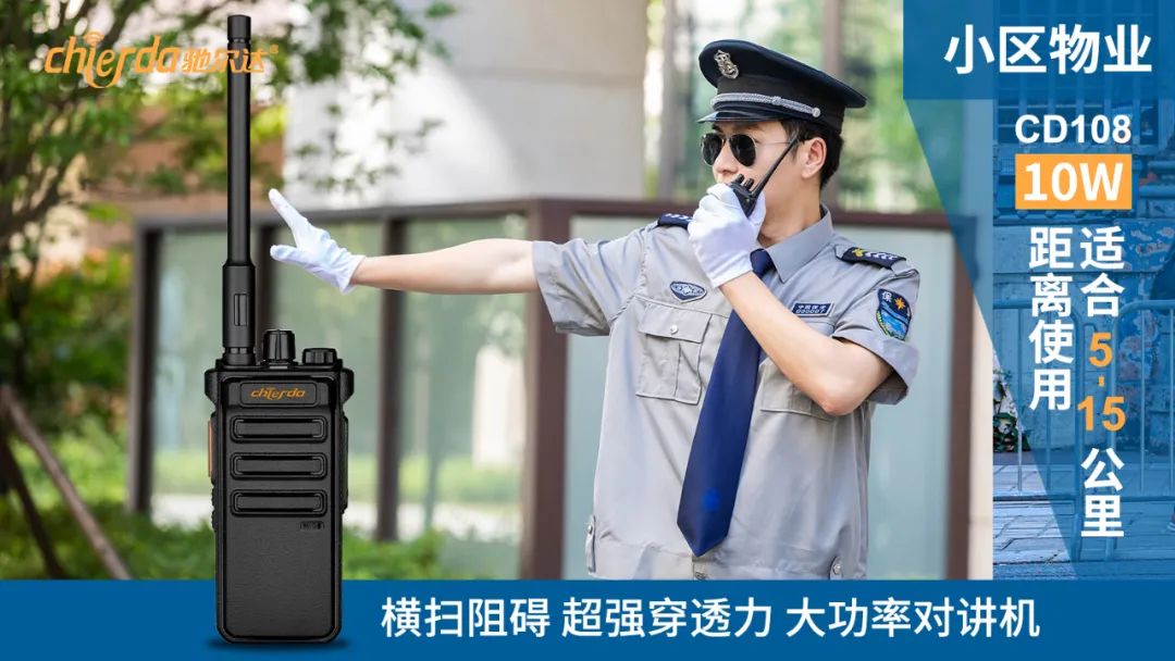 2)馳爾達CD-108型號,10w, (5-15Km)強大輸出功率,保證更遠通話距離與更廣闊的信號覆蓋,擁有LED強光手電、VOX聲控、靜噪設置等,全面滿足多元化通信需求,是安保對講機的上乘之作。